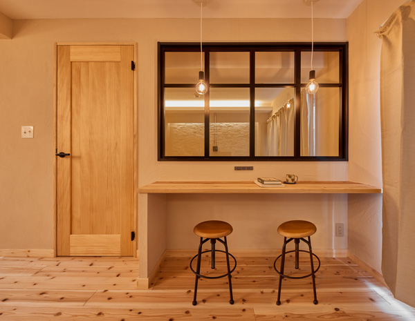 2階のリビングはワンフロアにし、吹き抜けや天窓で明るさと解放感を演出。3階は廊下の一部をワークスペースにし、壁をスリットにすることで更に開放的な空間になるように設計しました。珪藻土の塗り壁とパイン材のナチュラルな風合いと相まって、家全体がさわやかな雰囲気に。室内窓をつけ、リビングにいても3階にいても、家族の気配を感じることのできる住まいとなりました。